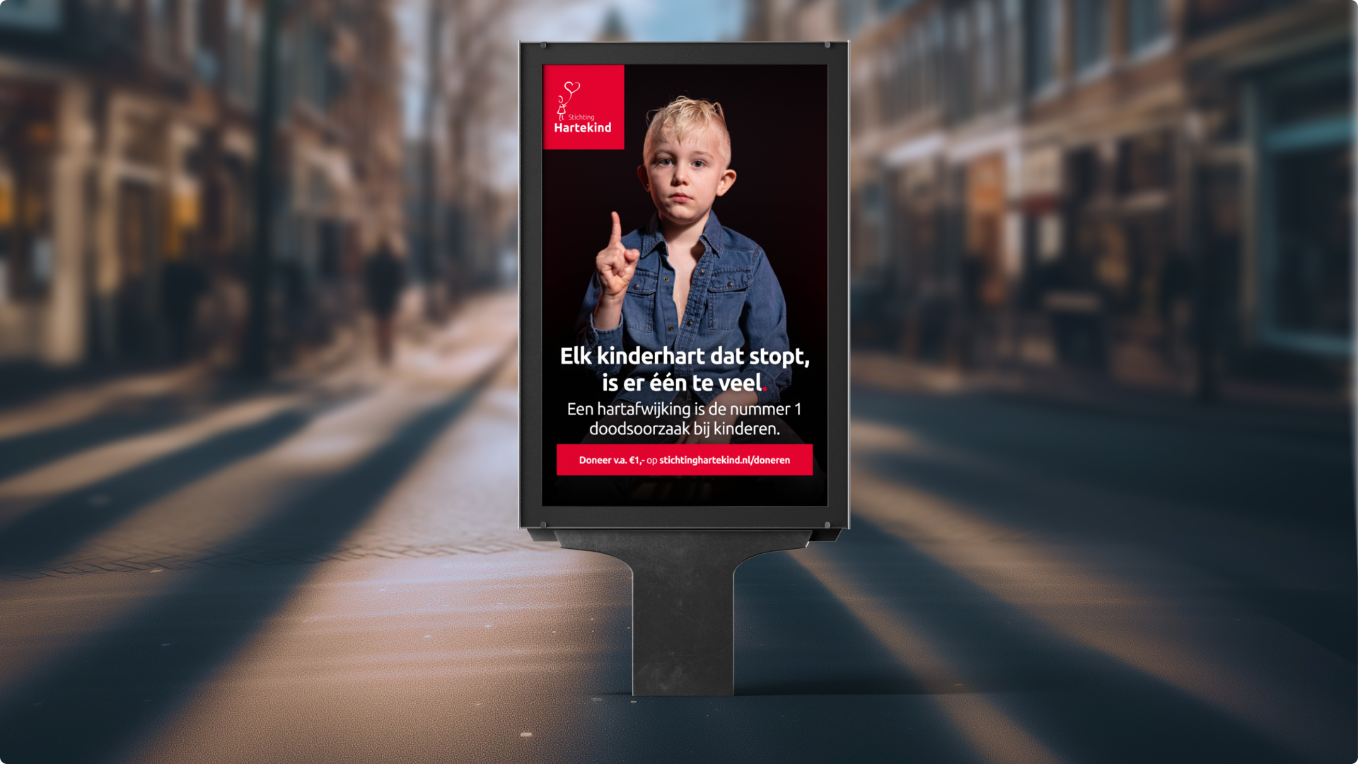Maar cijfers alleen raken niet. Dus maakten we het menselijk. Eerlijk. En dichtbij. Zo kwamen we tot de kern van het concept: ‘Elk kinderhart dat stopt, is er één te veel.’Krachtig in z’n eenvoud. Vol emotie. En met een boodschap die je niet zomaar vergeet.